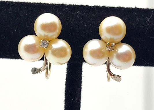 14K Triple White Cultured Pearl Three Leaf Clover & Diamond Screw Back Earrings