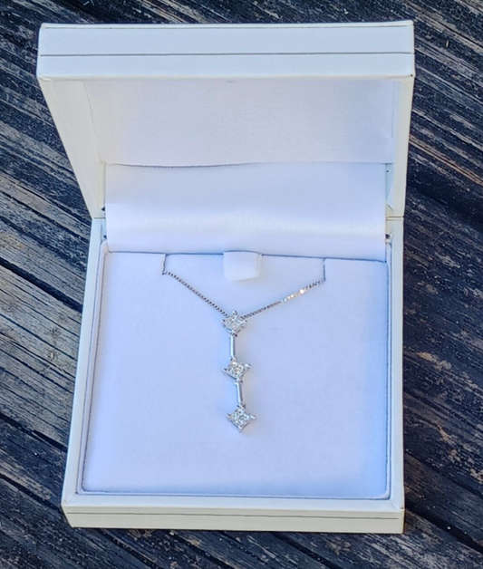 1.2CT Princess 3 Stone Diamond 14K Pendant w/ 14K White Gold Box Chain